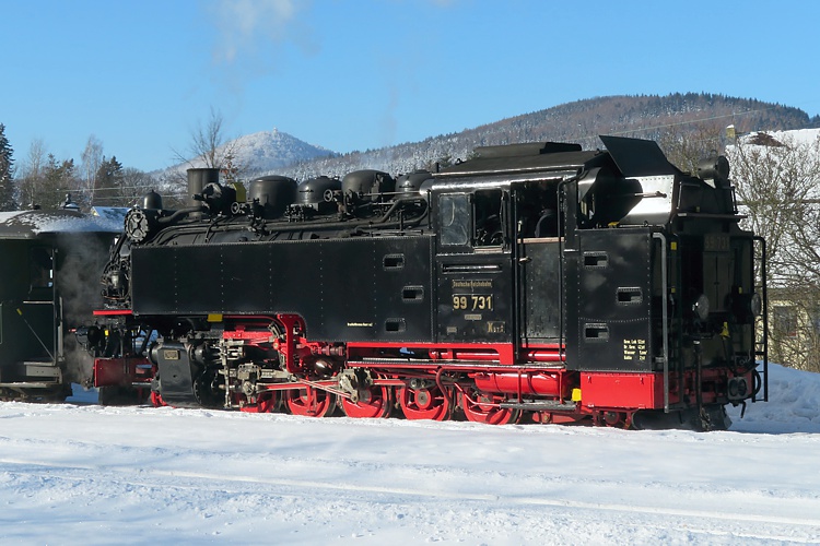 99 731 bei Kaiserwetter im Bahnhof Kurort Oybin