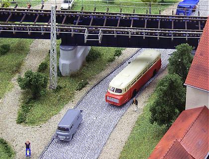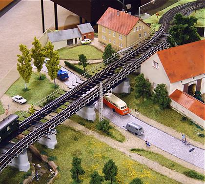 Einen schönen Blick auf die Brücke zeigt dieser Anlagenausschnitt. Leider können die Reisenden im Zug diesen Anblick aus den Waggonfenstern nicht genießen.
