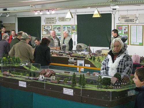 Als Ausblick auf die Modellbahn-Ausstellung im Jahr 2014 waren im Modellbahnhof Jonsdorf Haltestelle (links im Bild) schon neue Gebäudemodelle aufgestellt worden.